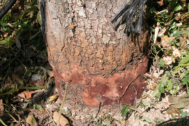 ◦ 병든 나무 발견 시 등록된 약제가 없으므로 사과에 등록된 약제를 이용하여 수관 아래 흙을 걷어낸 다음 감염된 뿌리는 제거하고 충분한 약액을 관주 처리하며, 걷어낸 흙에도 약액을 잘 섞은 다음 다시 덮어 방제하되 잔류 및 약해 등에 유의함