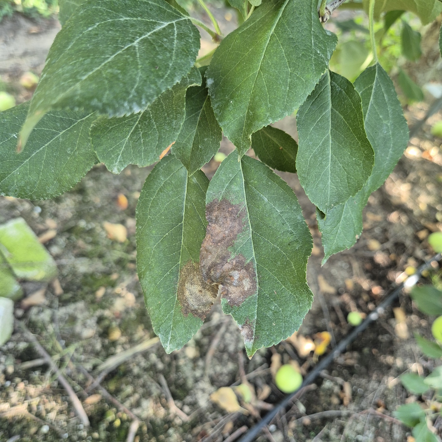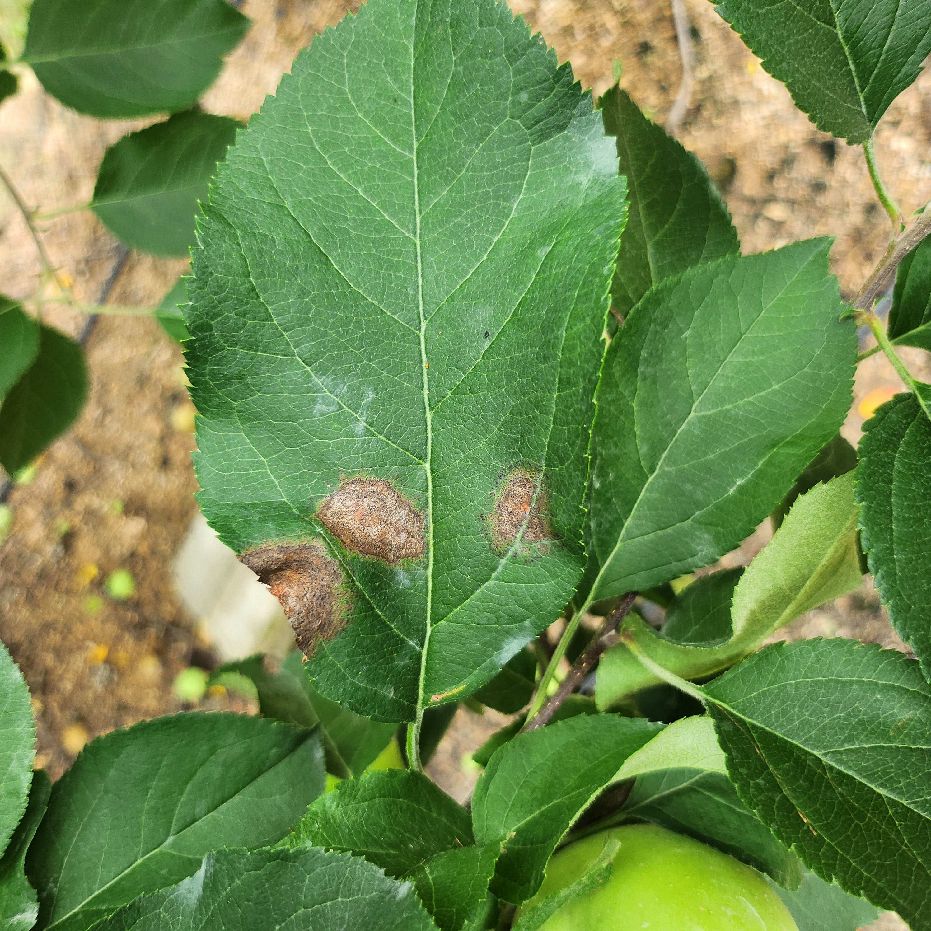 ◦ 과일에는 5~6월부터 과점을 중심으로 갈색 반점이 나타나고 품종에 따라 다르나 병반 주위가 붉은색으로 변함