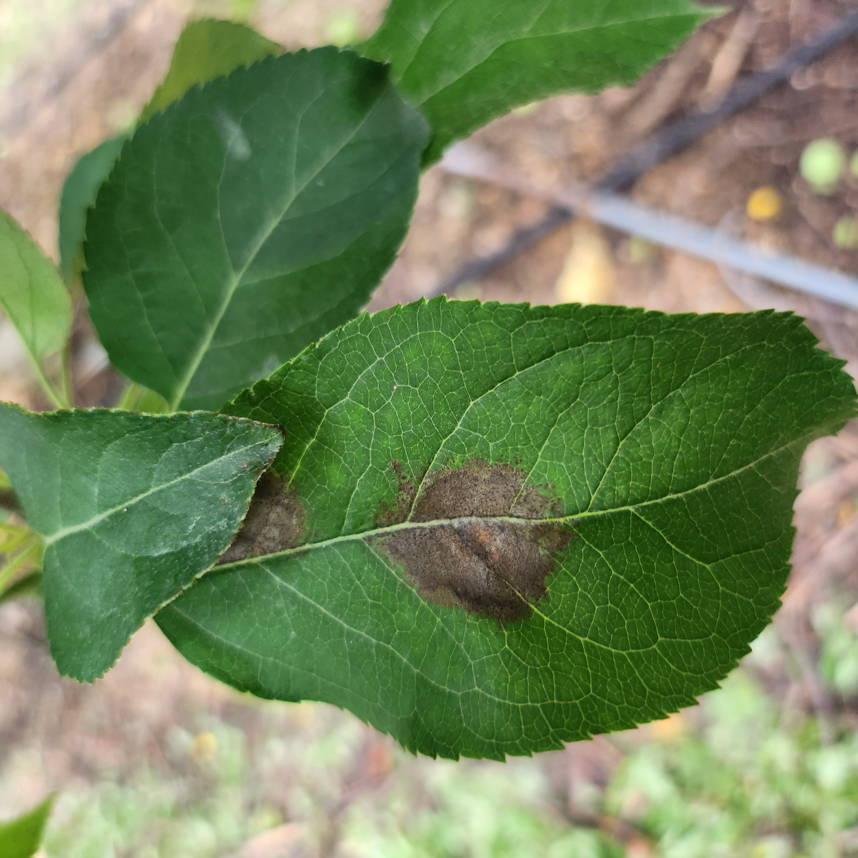 ◦ 잎, 과실, 가지에 발생하나 주로 잎과 과실에 발생, 갈색무늬병과 유사하여 혼동