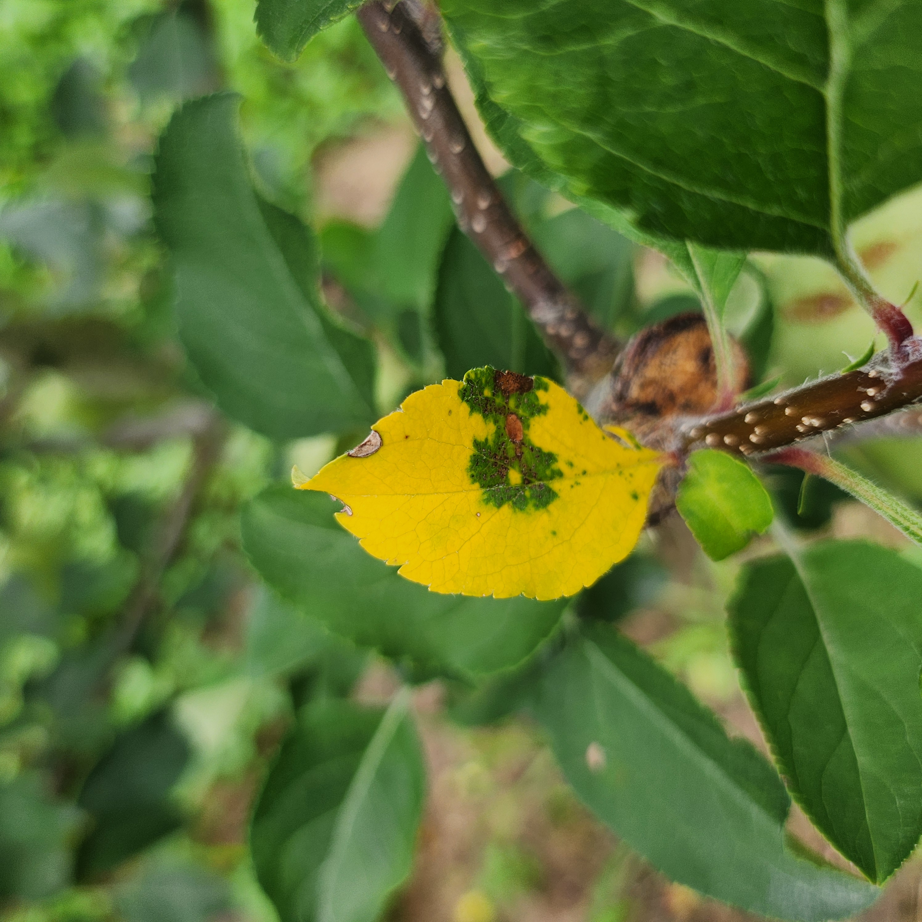 ※ 황색 낙엽 중 녹색부위 갈색병반이 병원균 침입 부위로 이 증상이 없는 황색 낙엽은 위조 등으로 변색된 것임