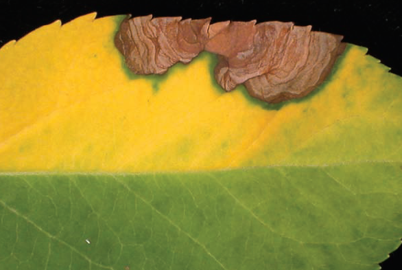 ◦ 잎의 둘레 혹은 끝부분에서 발병이 시작되는 경우가 많고 심하면 낙엽이 됨