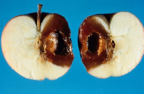 ◦ 과실에는 방제가 소홀한 포장에서 간혹 발생하나 큰 피해는 없으며, 저장 중 과실의 과경부가 수침상, 암갈색으로 변하여 과실의 중심부로 확대되고 심하면 과실 전체가 부패됨