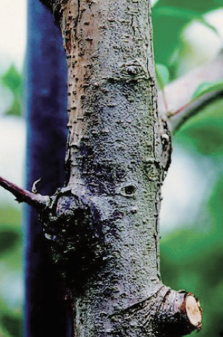 ◦ 가지는 쇠약지에 주로 발생하며, 이병가지는 수피가 부패하여 병든 부위가 암갈색으로 변하고 움푹 들어가며, 병환부 표면에는 흑색의 병자각이 형성되고 점차 심해지면 병반이 가지둘레로 확산, 상부의 가지가 갑자기 말라 고사하게 됨