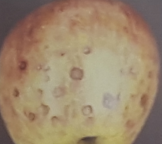 ◦ F. tricinctum에 의한 과실의 병징은 과점을 중심으로 갈색 반점이 다각형 혹은 원형으로 형성되고 표징(병원균)이 관찰되지 않으나 병반부가 코르크화 되는 것처럼 되고 병징은 쉽게 진전되지 않음