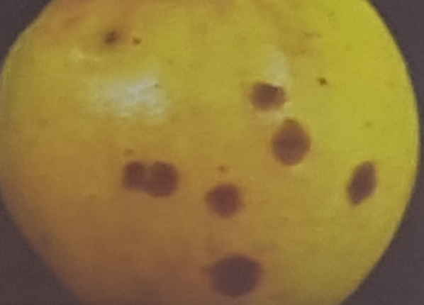 ◦ F. decemcelluare에 의한 과실의 병징은 과점을 중심으로 갈색 반점이 원형으로 형성되고 병반부에서 표징(병원균)이 관찰되지 않으며, 윤문이 형성되지 않고 함몰되면서 부패되지 않는 것이 특징임