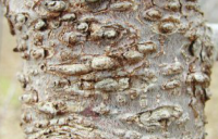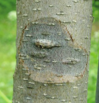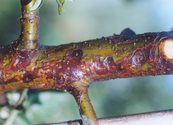 ◦ 가지에서는 사마귀형성(조피), 굵은 가지의 윤문증상, 가지마름 증상 등으로 나타나는데, 사마귀 증상의 피해가 가장 큼