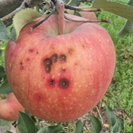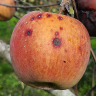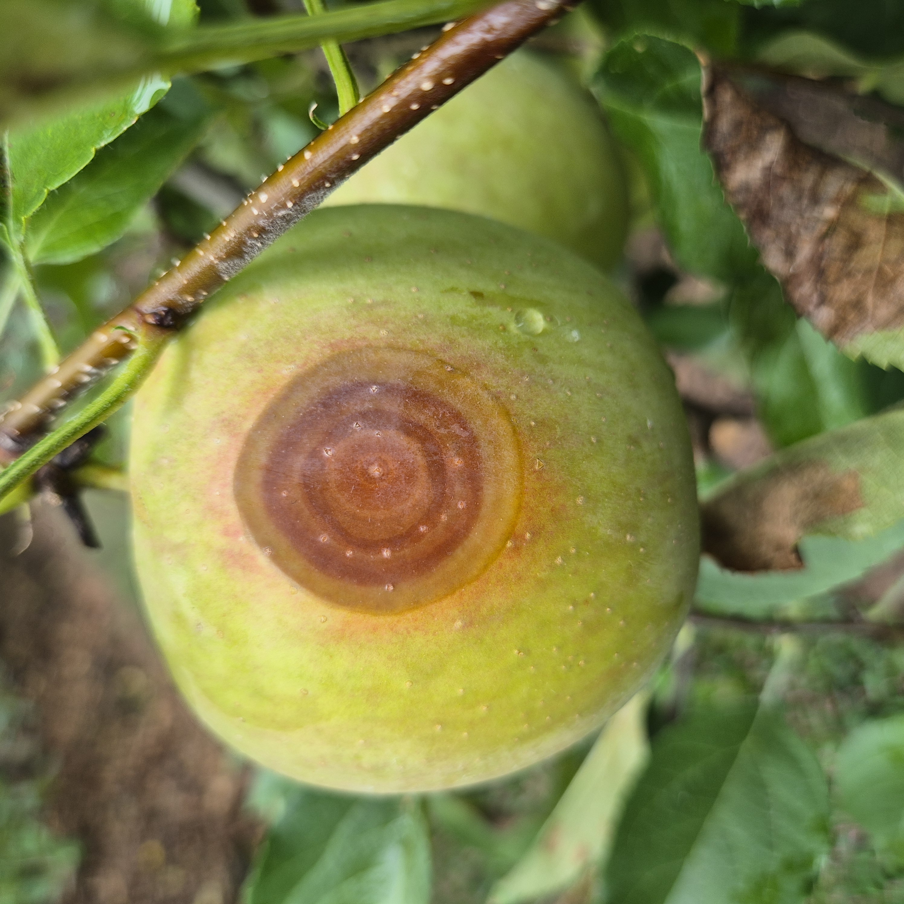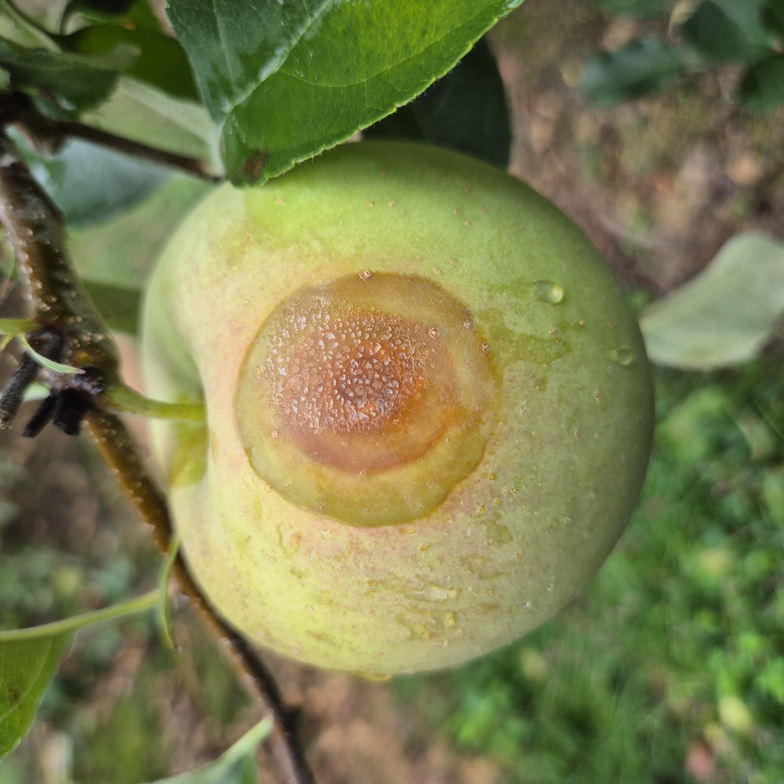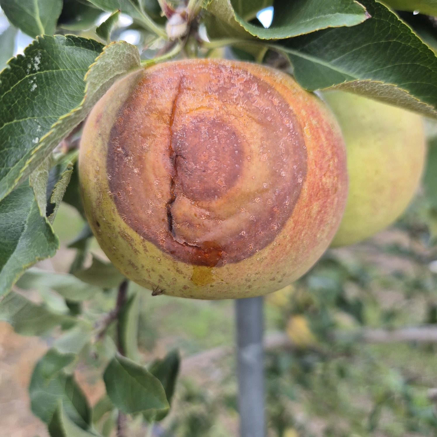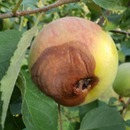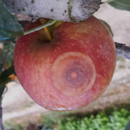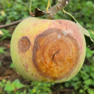 ◦ 과실에는 처음 황갈색의 작은 반점이 생기고 점차 확대외어 윤문상의 큰 병반이 형성되며, 심하면 물이 흐르고 과일 전체가 부패 낙과함