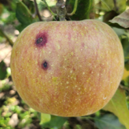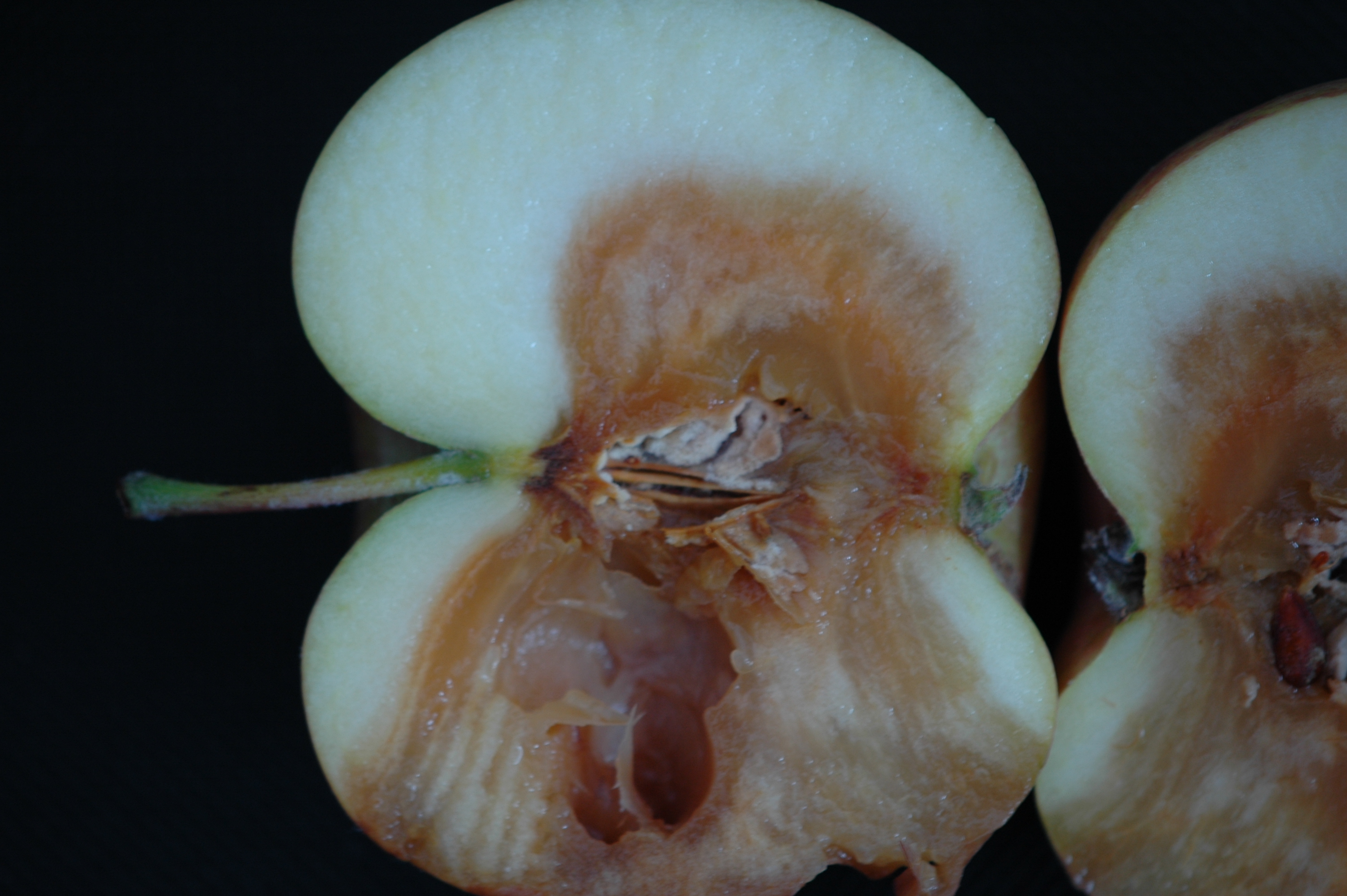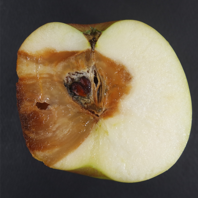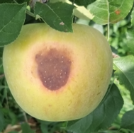 ◦ 탄저병과 다른 점은 중앙에 까만 소흑점(병자각)이 형성되고 과일을 쪼개보면 심부까지 부패하고 병반이 함몰되지 않는 것이 특징