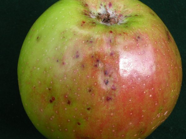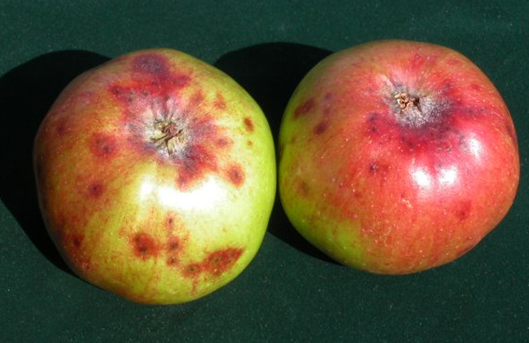 ◦ 과실의 양광면 부위에서는 과점 부위가 짙은 갈색의 반점증상이 발생되며, 반점주변은 보라색 혹은 짙은 보라색으로 착색되고 과점주변 부위는 붉은색의 달무리 증상이 발생되며, 녹색의 수침상 증상이 발생