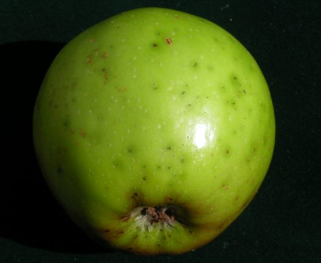 ◦ 과점을 중심으로 1~5mm 크기의 반점이 발생하며, 과실 음광면 부위에서는 과점 부위가 짙은 갈색의 반점증상이 발생되고 주변 부위로 녹색의 수침상 증상이 발생