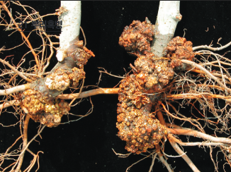 ◦ 병원균에 의해 혹이 발생하고 크기는 지름이 수mm 이상으로 발생부위는 주로 뿌리 및 지제부 밑의 줄기에 발병되나 가끔 지상부 줄기에 상처를 통해 발병하기도 함