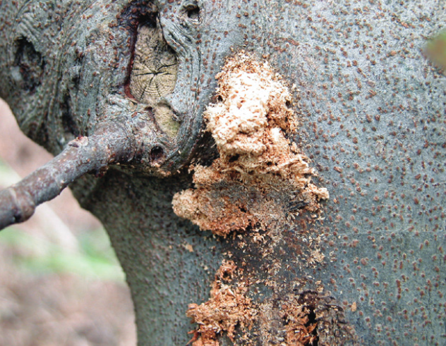 ◦ 피해를 받은 나무는 수세가 약해지고 심하면 나무 전체가 고사하며, 피해 부위에는 줄기썩음병을 유발하는 등 2차적인 피해를 주기도 함