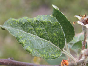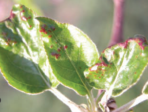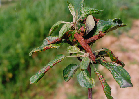◦ 피해부위는 엽록소가 없어지고 흑색으로 변하여 조기 낙엽되며, 심하게 피해를 받은 가지는 가늘고 약한 가지들이 많이 나와 결실가지로 사용되지 못함