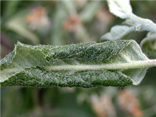 ◦ 신초의 선단부의 연한 잎을 가해하면 붉은 반점이 생기고 잎가에서 엽맥 쪽을 향하여 뒤로 세로로 말리며, 그 속에서 무리지어 가해