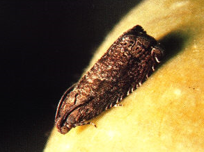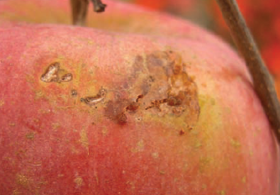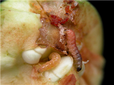 ◦ 어린과실의 경우 보통 꽃받침 부분으로 침입하여 과심부를 식해하고 다 큰 과실은 꽃받침 또는 과경 부근으로 식입하여 과피 바로 아래 과육을 식해하며, 일부는 과실의 측면을 핥듯이 가해하여 잎말이나방의 피해로 오인