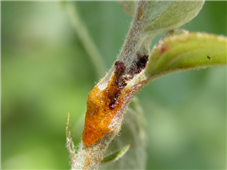 ◦ 유충이 신초 선단부를 먹어 들어가 신초가 꺾여 말라 죽으며, 진과 똥을 배출하므로 쉽게 발견 할 수 있음