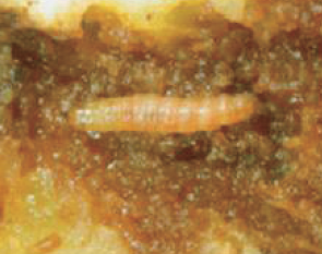 ◦ 약~중령기 유충은 백색이고 머리 부분이 검으며, 노령기 유충은 전체가 붉은 빛을 띠고 10~13mm 정도임