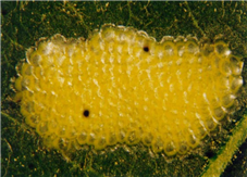 ◦ 유충은 길이가 17mm 정도이고 몸은 황록색으로 홑눈과 뺨에 흑갈색의 얼룩무늬가 있음