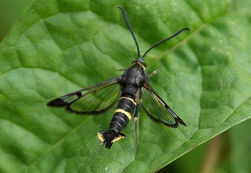 ◦ 성충의 몸길이는 14~17mm이고 날개편길이는 25~32mm이며, 날개는 가늘고 투명한데 몸과 날개의 가장자리는 흑색이고 복부에 2개의 황색 선이 있으며, 언뜻 보면 벌과 같이 보임