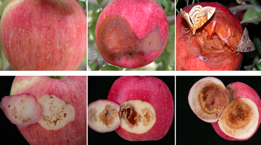 ◦ 성충이 밤에 사과원으로 날아와 과실을 흡즙하므로 과실 겉면에 자세히 살펴보면 바늘로 찌른 것 같은 구멍이 나 있음