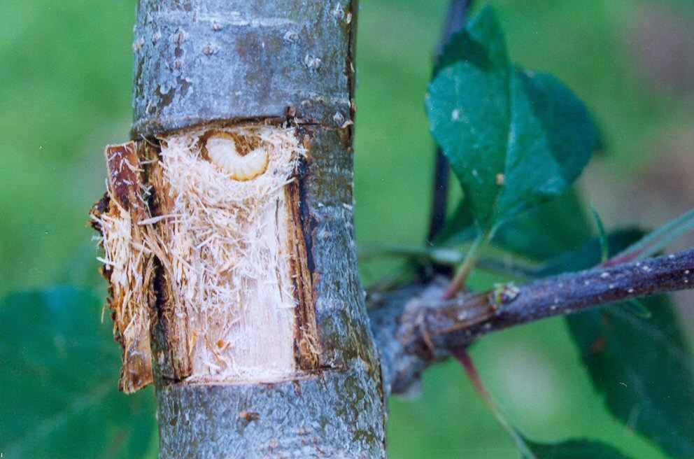 ◦ 성충이 가지에 이빨로 상처를 내고 산란하고 부화한 어린 유충은 껍질 밑의 형성층을 식해