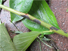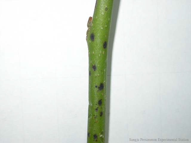 ◦ 새 가지에는 보통 늦은 봄(5월경) 나타나기 시작하고 처음에 까만 반점이 생기고 이것이 점차 가지의 아래 위로 길게 확대되어 암갈색의 타원형 병반이 되어 움푹하게 들어감