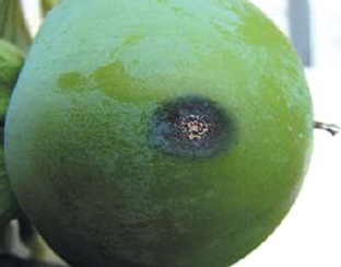 ◦ 6월 이후에는 어린 과실에 감염하여 암갈색 타원형 병반이 나타나고 곧 낙과함
