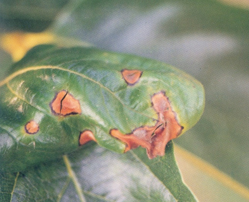 ◦ 잎에서는 처음 원형의 검은점무늬로 나타나고 진전되면 부정형으로 확대되면서 병반의 내부는 갈색을 띠고 병반의 테두리는 암갈색 내지 흑색을 띰