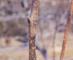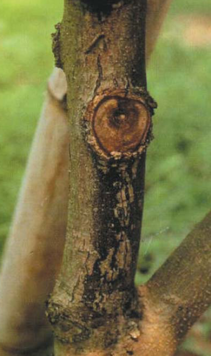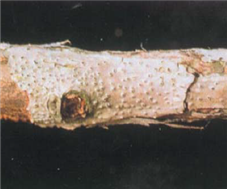 ◦ 병에 걸린 가지는 건전한 것과 비교하면 피목이 크고 융기되어 있으며, 피목에 작은 발진 모양의 융기점이 밀생되어 있음