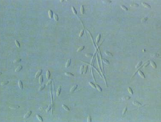 ◦ 불완전균에 속하며, 병자각은 준구형 내지 계란모양, 크기 300~450×50~ 90㎛, 병포자는 α포자(방추형, 크기 5~9×2~3㎛), β포자(낚시바늘 모양, 크기 33~40×1~1.5㎛)