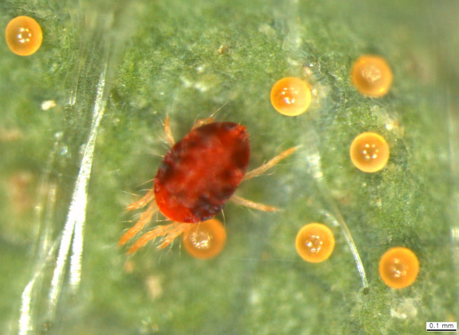 ◦ 수컷 성충은 0.3mm 정도이고 몸은 담갈색으로 홀쭉하며, 배 끝이 뾰족하고 다리가 긴 특징