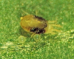 ◦ 암컷 성충은 난형으로 몸길이가 0.4~0.5mm이고 여름형은 담황록색 바탕에 좌우에 뚜렷한 검은점이 있으나 월동형은 귤색으로 검은점이 없음