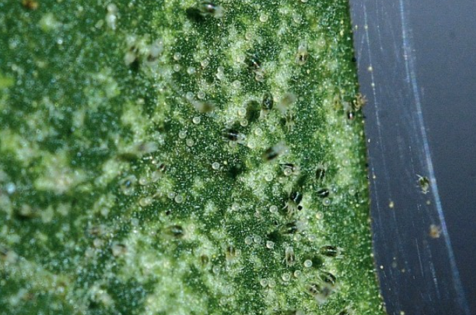◦ 약충과 성충이 잎 뒷면에서 엽록소를 흡즙하기 때문에 잎 표면에 바늘로 찌른 듯한 흰점이 많이 생김