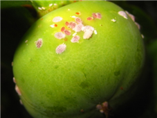 ◦ 밀도가 높아지면 전 과일 표면을 덮어 가해하고 표면을 흡즙하여 탈색은 물론 조기낙과를 초래하며, 피해가 가장 심한 시기는 8월경으로 상품화율에 직접적인 영향을 줌
