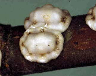 ◦ 수컷 깍지벌레는 별모양의 돌기가 나타난 모양이고 암컷 깍지는 월동 깍지에 비하여 현저하게 작고 각지의 중앙 부분이 약간 돌출됨