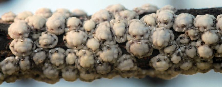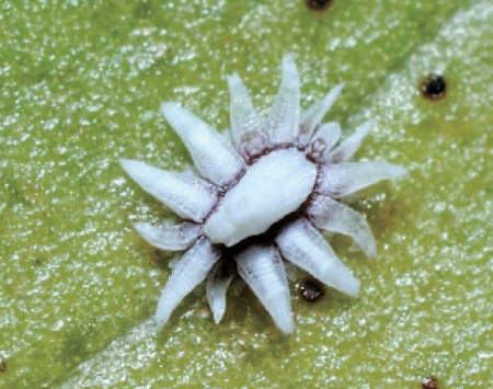◦ 부화약충은 편평하고 원형으로 자갈색을 띠고 5~7일부터 밀랍을 분비하여 별모양의 깍지를 형성함