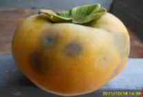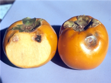 ◦ 피해를 심하게 받은 과실은 낙과하고 보통의 경우 감꼭지 주변에 심하게 변색된 형태로 나타나고 피해율은 1~10%에 이름