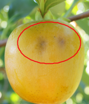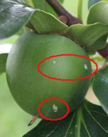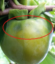 ◦ 7월 상순부터 흡즙된 어린 감은 즙액이 유출되고 그 후 낙과되며, 성과기에는 조직이 함몰되고 스폰지화 되면서 곶감 제조 시 상품성이 떨어짐
