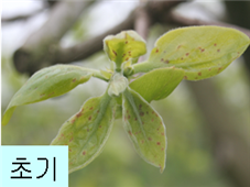 ◦ 어린 과실도 일부 가해하여 검은색 반점을 남기는데 과실이 자라면서 표면이 거칠어져 언뜻 보기에는 동녹 증상으로 보임