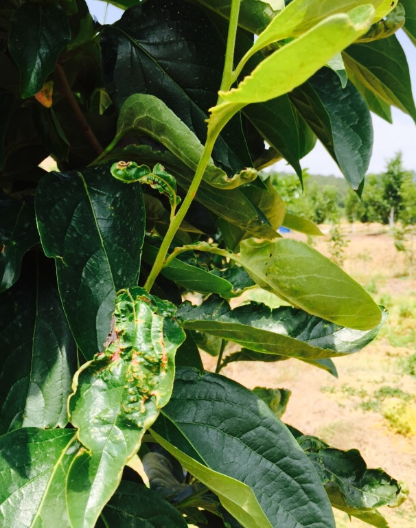 ◦ 성충과 약충이 어린 잎을 흡즙하여 초기에는 갈색반점의 형태를 띠다가 완전히 전개된 잎에는 불규칙하게 구멍이 생기고 자라면서 너덜너덜해지거나 기형이 되며, 꽃받침 밑부분을 가해하면 갈색으로 변하며 탈락하게 됨