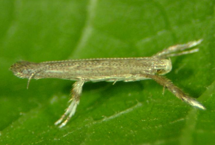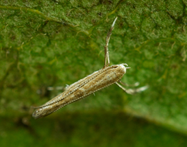 ◦ 성충의 몸길이는 3mm 정도 되는 연한 갈색의 작은 나방으로 더듬이의 길이가 몸길이와 같음