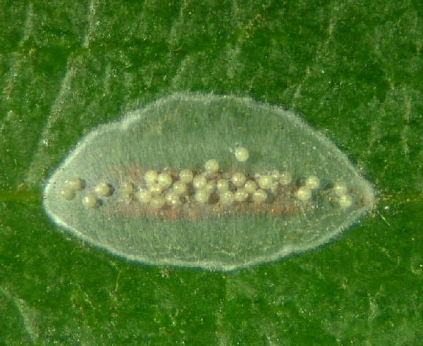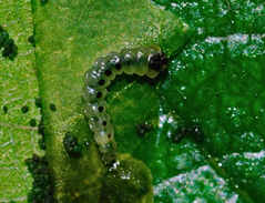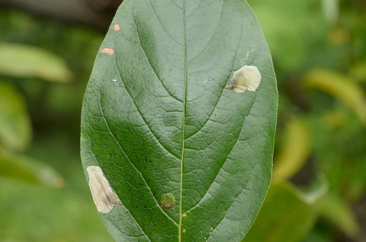 ◦ 7월경부터 피해가 쉽게 관찰되고 8월과 9월에 급증하며, 유충이 성엽의 앞 면에서 표피 아래에 불규칙한 원형의 굴을 파고 그 안에서 섭식함