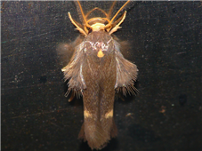 ◦ 성충의 몸길이는 6~7mm, 날개 편길이 14~19mm, 머리는 금속광택이 있는 갈색이고 가슴은 흑갈색, 배는 암회백색, 가슴 등쪽에 황갈색의 타원형 무늬가 있고 앞날개의 앞끝 가까이에도 황갈색 무늬가 있음