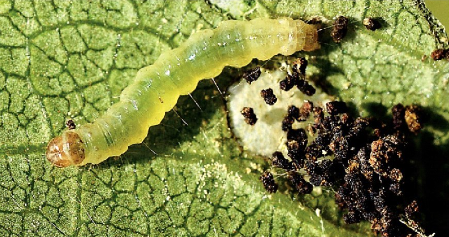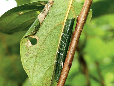 ◦ 유충이 감 잎의 가장자리를 세로로 뒤쪽으로 말고 그 속에서 섭식하면서 똥을 모아둠