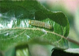 ◦ 1세대 유충은 6월 중순~7월 중순까지 유과와 새가지 끝의 잎을 세로로 말면서 갉아 먹음