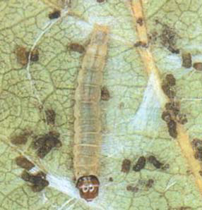 ◦ 유충은 부화 초기부터 다 자랄 때까지 잎을 말고 잎 가장자리를 갉아 먹어 피해를 입히는데 갉아먹은 자리는 매우 거침