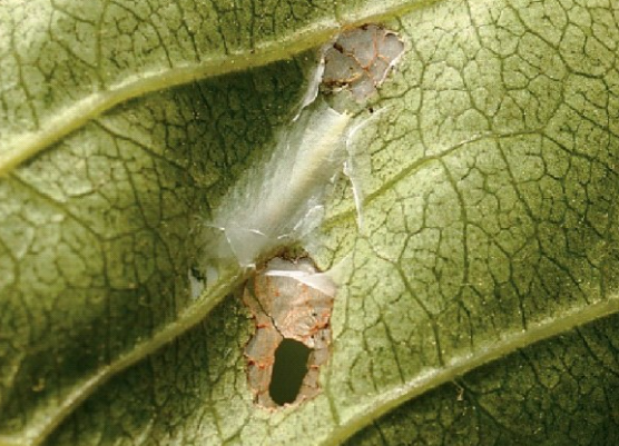 ◦ 유충이 잎 뒷면에서 실로 얇게 그물집을 짓고 그 속에서 엽육을 가해함