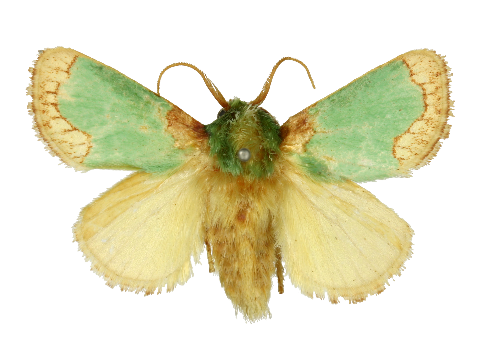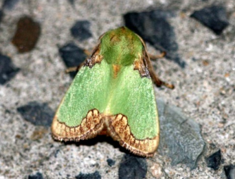 ◦ 성충의 앞날개 길이는 15~16mm이며 담녹색으로 앞날개 외연부에는 둥근 황갈색 띠가 있고 기부에는 갈색 무늬가 있음