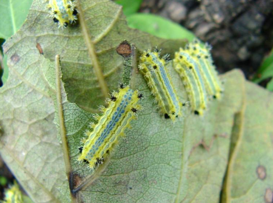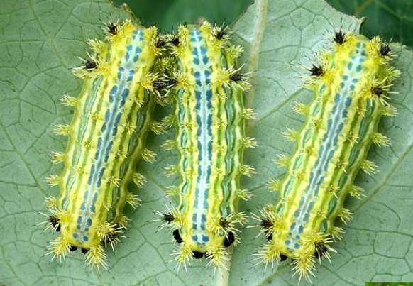 ◦ 어린 유충은 모여 살며 잎살만을 식해하나 성장하면 분산하여 잎 전체를 가해함