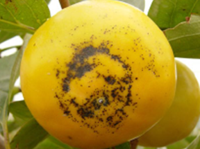 ◦ 과실이 착색기에 이르면 감나무 위 또는 수확 후의 과실 표면에 엷은 검은 점 또는 가는 선과 구름모양 등의 검은 무늬가 생김